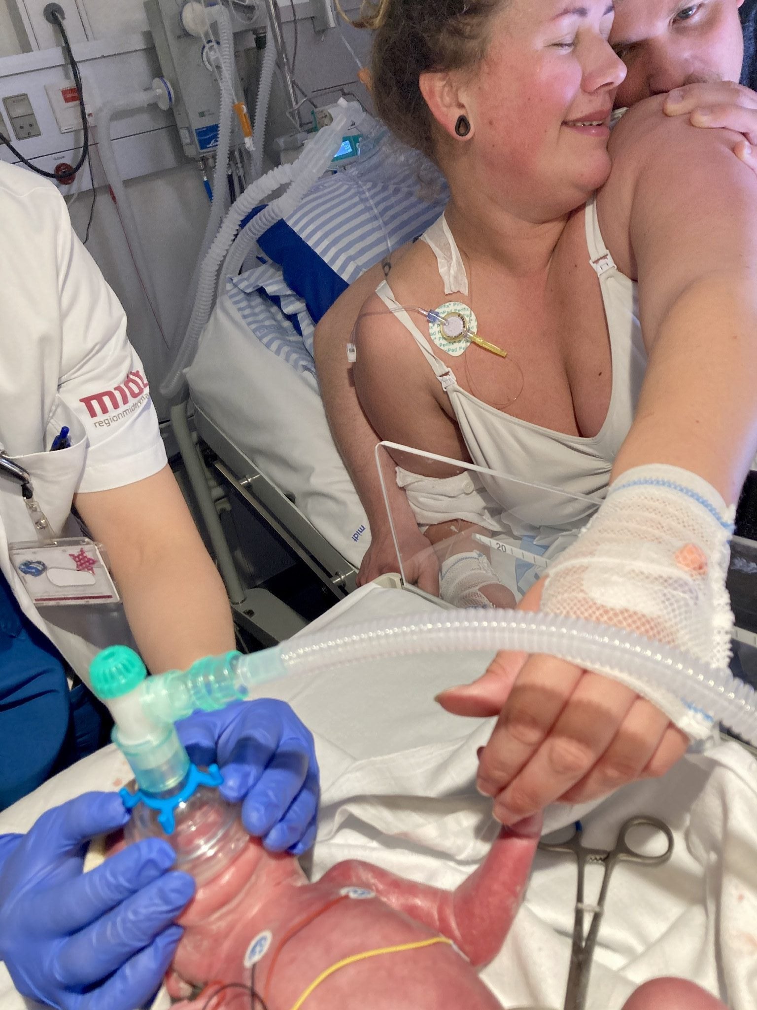 Jeg fik lov at få min datter op på maven i et splitsekund, efter hun kom ud – noget jeg brændende ønskede, hvis det var muligt – før hun blev taget fra mig af kyndige faglige hænder. Hun skreg et skingert men fint lille skrig. Jeg fik et kort sus af lettelse, fordi så var hun her ægte, og hun havde kræfter til at skrige! Min lille kriger.