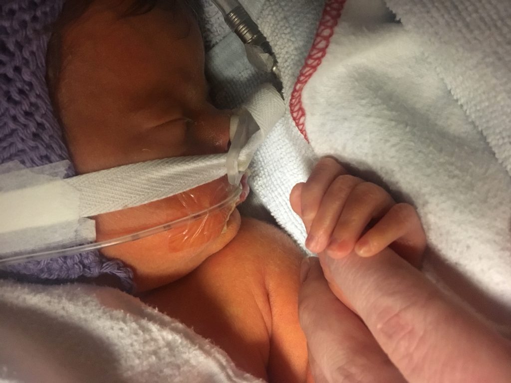 De første to uger efter Emmas fødsel var vi indlagt. Først en uge på Rigshospitalet og derefter en uge på Næstved Sygehus. Emma havde svært ved at trække vejret selv og måtte i form af ilt og c-pap få hjælp til at overkomme apnøer . Hun havde enormt svært ved at amme, og vi måtte give op ret hurtigt og gå på flaske. Hun fik lagt en næsesonde, så vi kunne supplere hendes behov med de mængder, hun ikke selv kunne tage. Men også her kæmpede hun, og vi gjorde alt hvad vi kunne for at få hende til at spise selv.
