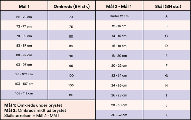 En bh størrelse består af to ting: omkreds og skål. Omkreds måles ved at holde et målebånd stramt omkring torsoen lige under barmen. Skålstørrelsen findes ved at trække målet under barmen fra det antal cm, som du måler på det bredeste sted om brystet, og her skal målebåndet ikke strammes.