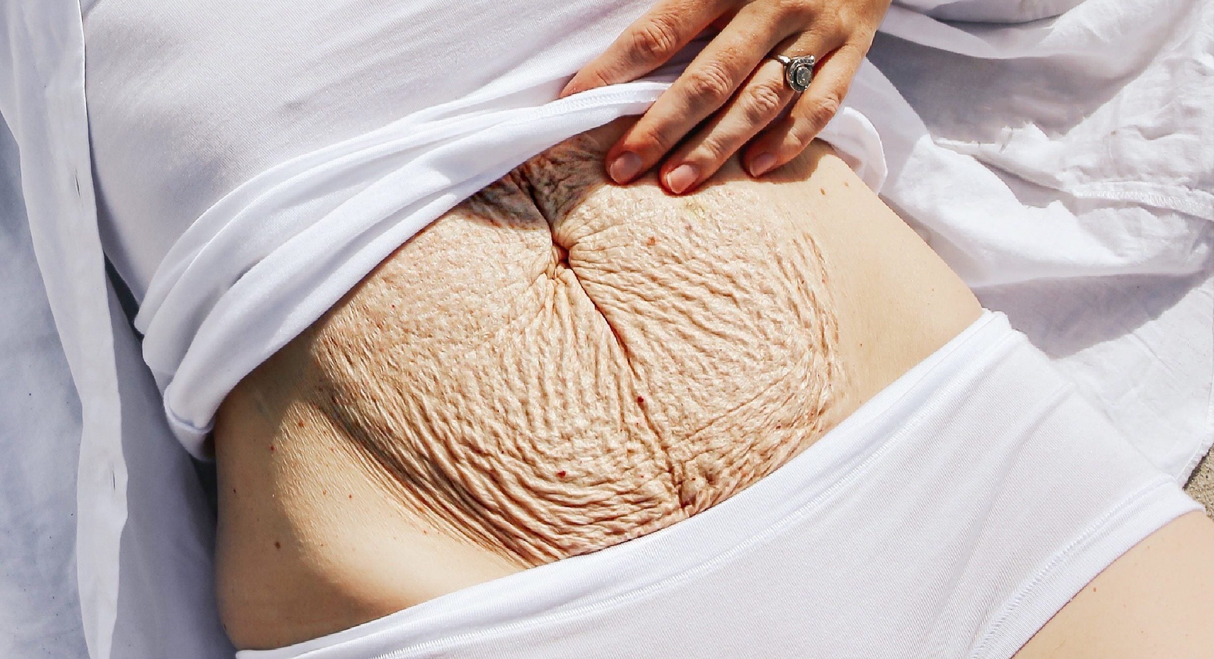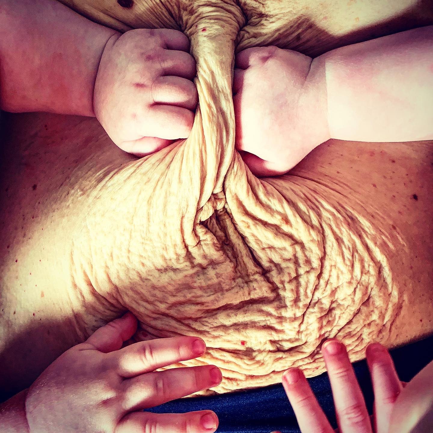 Bittesmå strækmærker overalt. En navle der nu sad på venstre side af maven. Store strækmærker hen over skambenet. Rynket og løs hud. Og ingen funktion af mine mavemuskler. Jeg kunne ikke løfte mig fra sengen eller komme op fra gulvet. Jeg kunne ikke stå op og lave mad, fordi min mave ikke kunne holde mig ordentligt oprejst. Min vejrtrækning var overfladisk, fordi jeg ikke kunne aktivere musklerne godt nok til at få luften helt ned i lungerne.