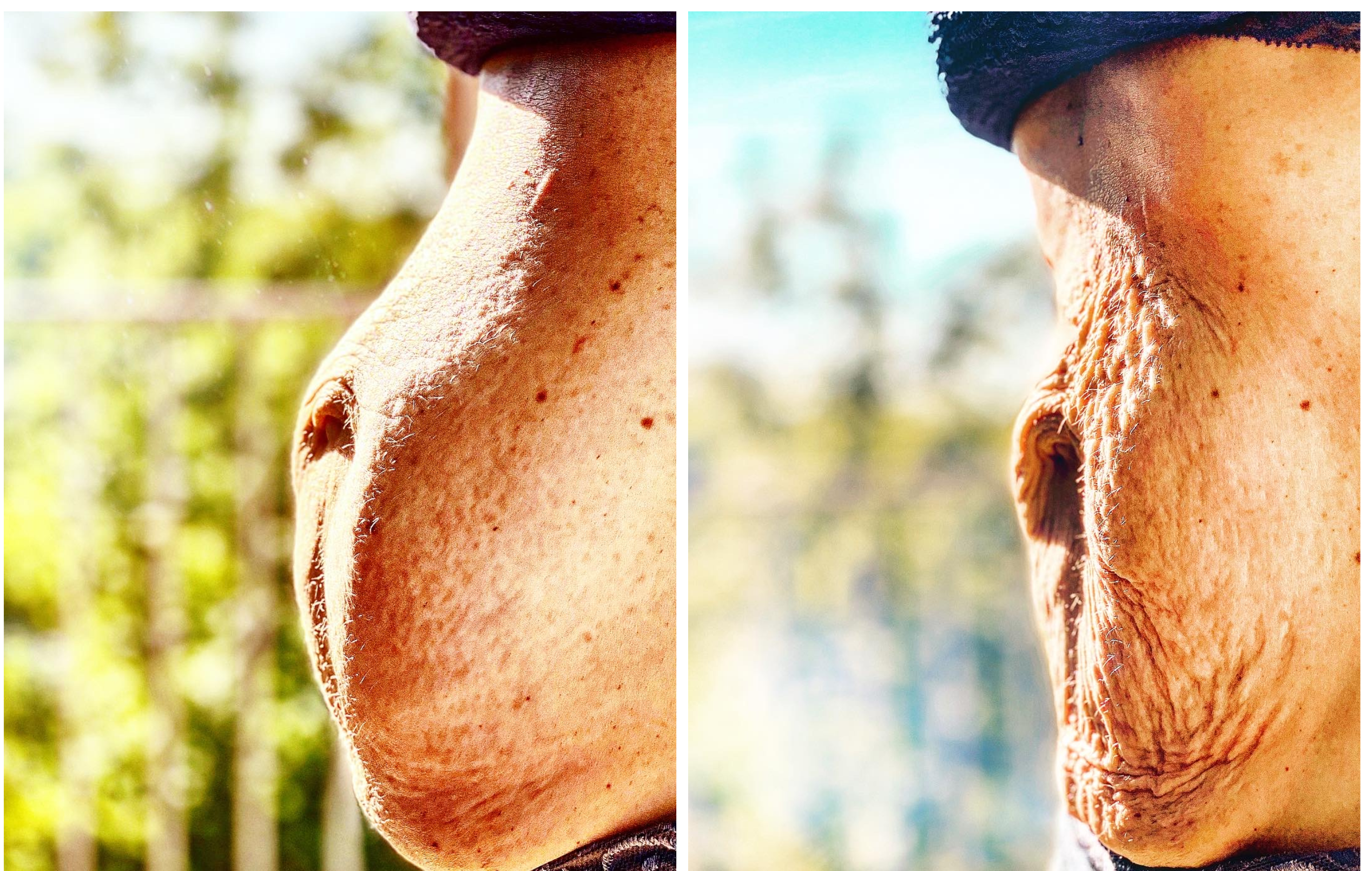 Jeg kæmper også stadig med mit udseende… Min mave buler som hos en gravid i 6. måned, min hud er rynket og hænger, og navlen ligner Bedstemor Piletræ fra Pocahontas. Inden jeg fik dullerne, havde jeg en flad og veltrænet mave. Jeg blev gift i bar mave på en strand på Seychellerne. Sammen med mine små meget velsiddende bryster var det mit absolutte yndlings-feature. Så det føles ondt, at jeg har mistet den og – ligesom alle andre kvinder, der har ammet i 2,5 år – selvfølgelig også mine bryster.