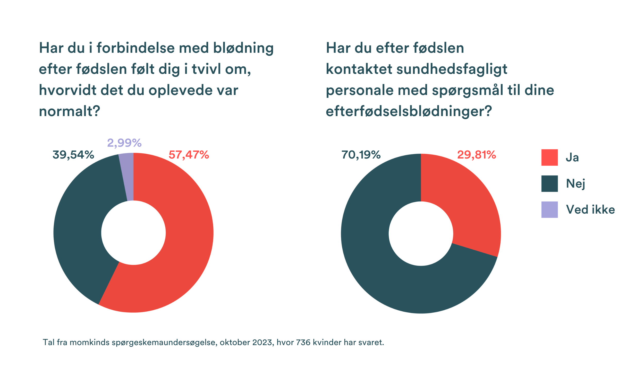 Vi finder det tankevækkende, at hele 57% har følt sig i tvivl, mens kun 30% henvendte sig til sundhedsfagligt personale med spørgsmål til blødningerne. Skyldes det mon skam? Nervøsitet for (ekstra) gynækologisk undersøgelse? Tidsmangel og hektik i barselsboblen?