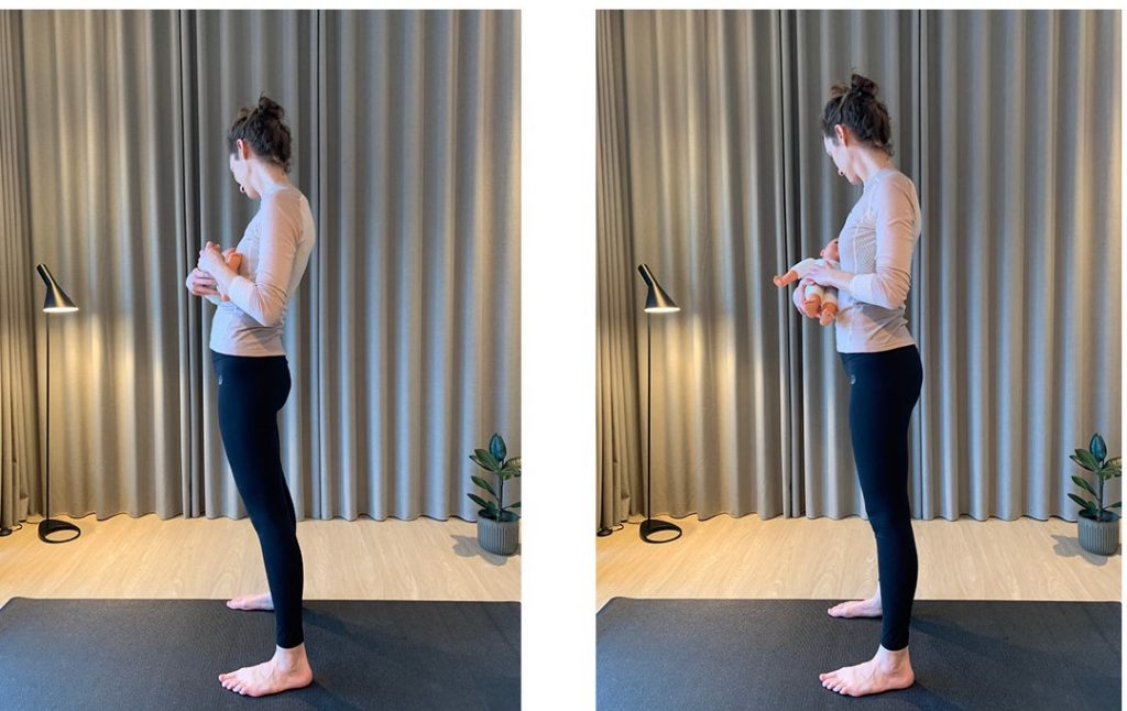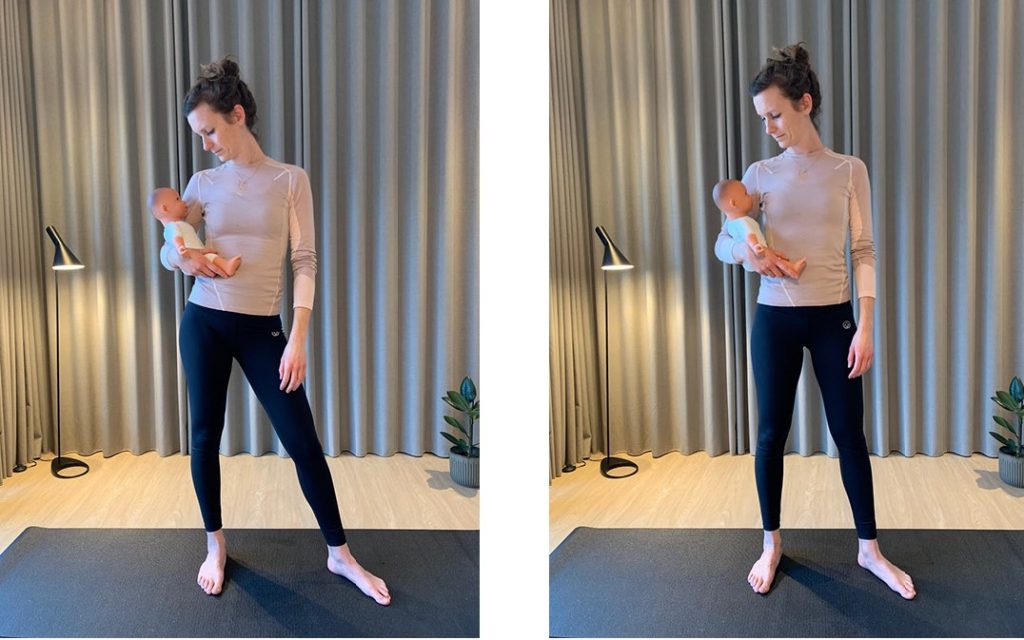 Ballerne er nemlig bækkenbundens anker og stærke, aktive baller giver en stærk og aktiv bækkenbund og kerne. I denne udgangsstilling bruger du aktivt dine ben og kropsstamme til at bære dig selv og din baby – uden at hænge i leddene. Det er et godt stimuli!