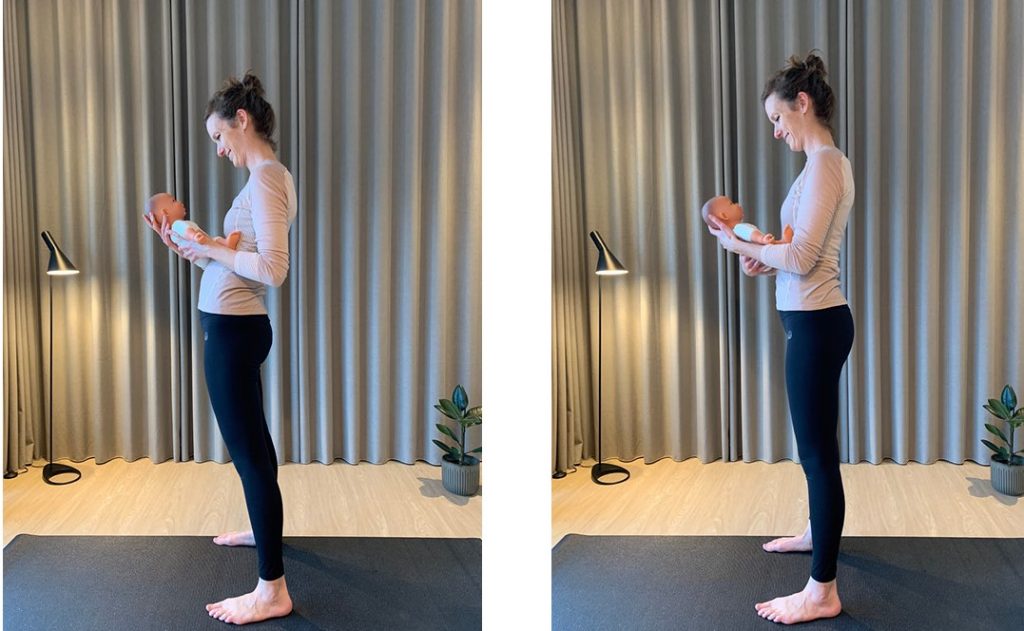 Under bevægelse, fx når man tømmer opvaskemaskine, løfter børnene op fra gulvet eller fra puslepuden, kan man tænke på at “stritte med bagdelen”. Det hjælper lænden til at bevare sit neutrale lændesvaj og giver større aktivitet i ballerne. Ud over at det ser markant bedre ud, stimulerer det også bækkenbund og kerne.