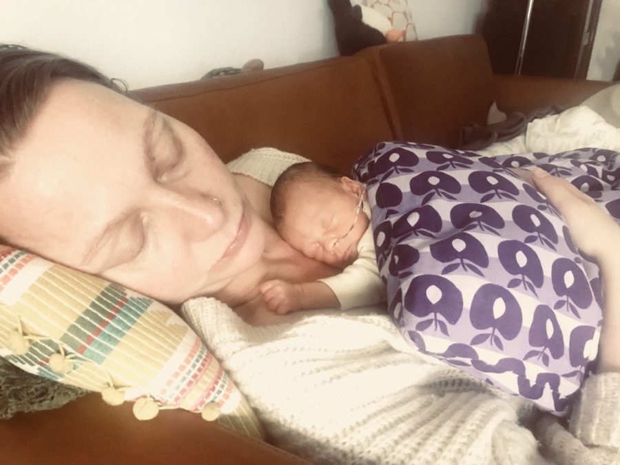 Endelig måtte jeg komme op til mit barn. Portøren var sød, men jeg kunne ikke vente på, at han fik parkeret sengen, så jeg hoppede ud og kom stavrende ind på stuen til min lille mus og mand. Bedste billede ever! Så lå hun der på hans bryst. Så rolig og fin med en lillebitte sonde, der sikrede at hun fik nok mad, da hun var for lille til at mætte sig fuldt ud ved amning. Hun havde også en CPAP, som er en lille maske, der hjælper med at trække vejret. Heldigvis skulle den kun bruges i et døgns tid.