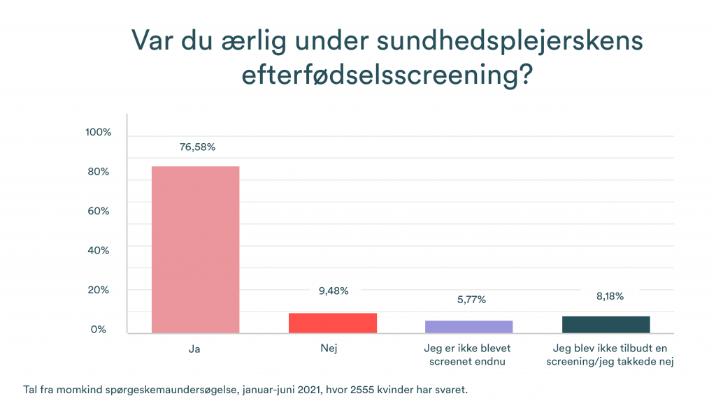 Vi finder det foruroligende, at omkring 10% af momkind-undersøgelsens 2200 respondenter ikke har følt sig trygge ved at svare ærligt til deres efterfødselsscreening. Som du kan læse, er begrundelserne mange, og det kunne være interessant at se, hvordan de ville fordele sig, hvis stikprøven var større.