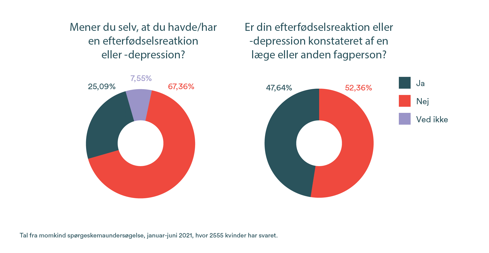 Af de 562 kvinder, der svarede, at de efter egen vurdering havde/har en efterfødselsreaktion, er kun omkring halvdelen blevet diagnosticeret af en sundhedsfaglig person. Man kan forestille sig, at diskrepansen til dels skyldes, at en andel af de berørte kvinder undlader at søge hjælp. Denne formodning underbygges af besvarelserne af spørgsmålet om efterfødselsscreening, hvor hele 10% af de adspurgte kvinder oplyser, at de ikke var ærlige.