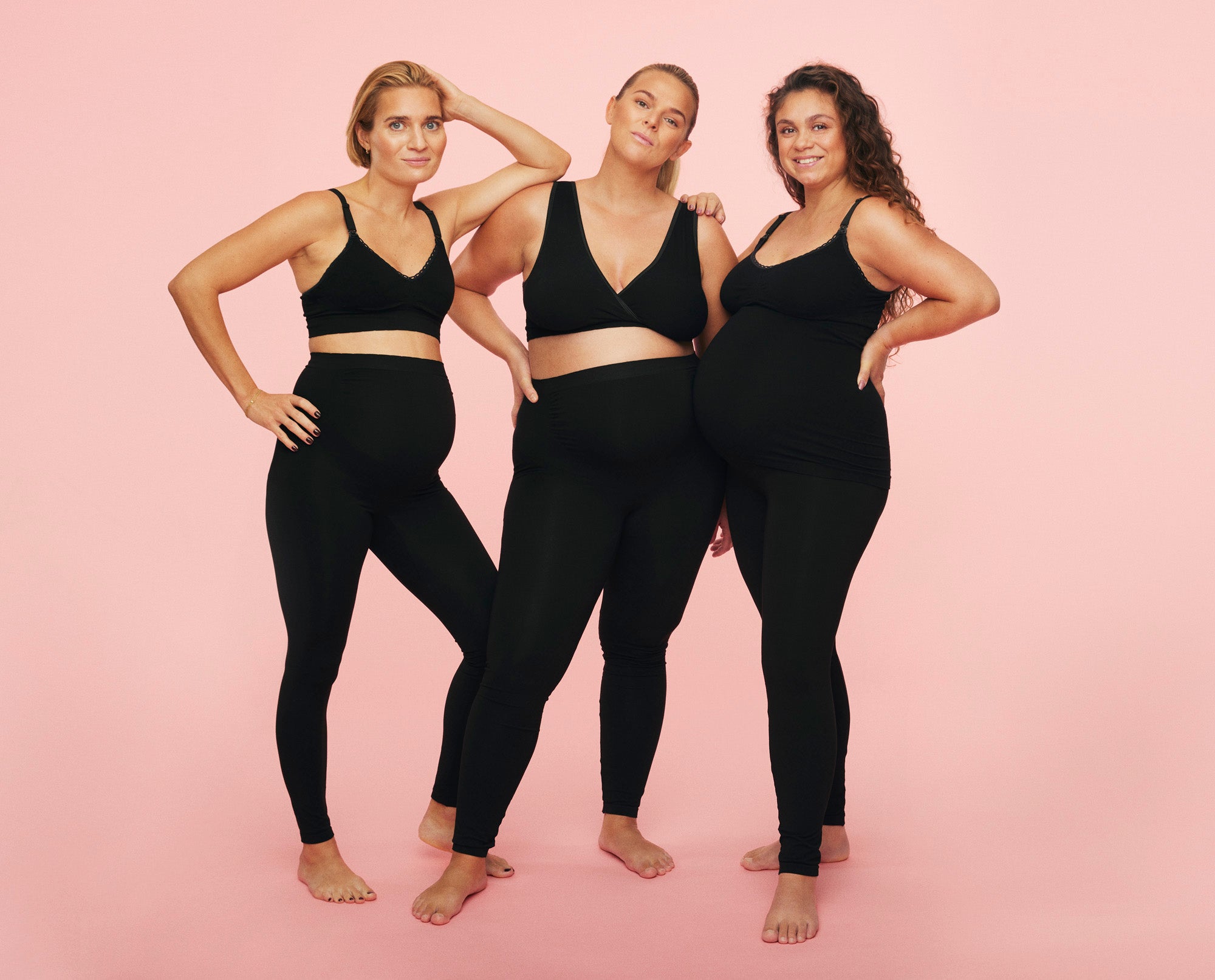 Vores belly support leggings kommer i tre størrelser: S, M og L/XL. Vi anbefaler, at du tager udgangspunkt i den størrelse, som du brugte, inden du blev gravid, med mindre, at du har taget meget på omkring hofterne. Modellerne på billedet (fra venstre mod højre) er iført følgende: S, L/XL og M.