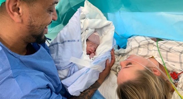 To uger inde i corona-lockdown og 5 1/2 uge før termin har hun ikke vendt sig. Jeg skal til jordemoder om tre dage. Jeg arbejder stadig og er i gang hele dagen. 30 minutter efter jeg er kommet hjem går vandet – som om en vandballon sprænger i vores stue. NEJ, tænker jeg bare! Ikke nu! Jeg er alene hjemme, hun ligger forkert og jordemoderen har i telefonen sagt, at hvis vandet går skal jeg ligge mig ned og hentes i en ambulance. Så det gør jeg! Grædende og panisk for at navlestrengen klemmes og vi mister vores pige.